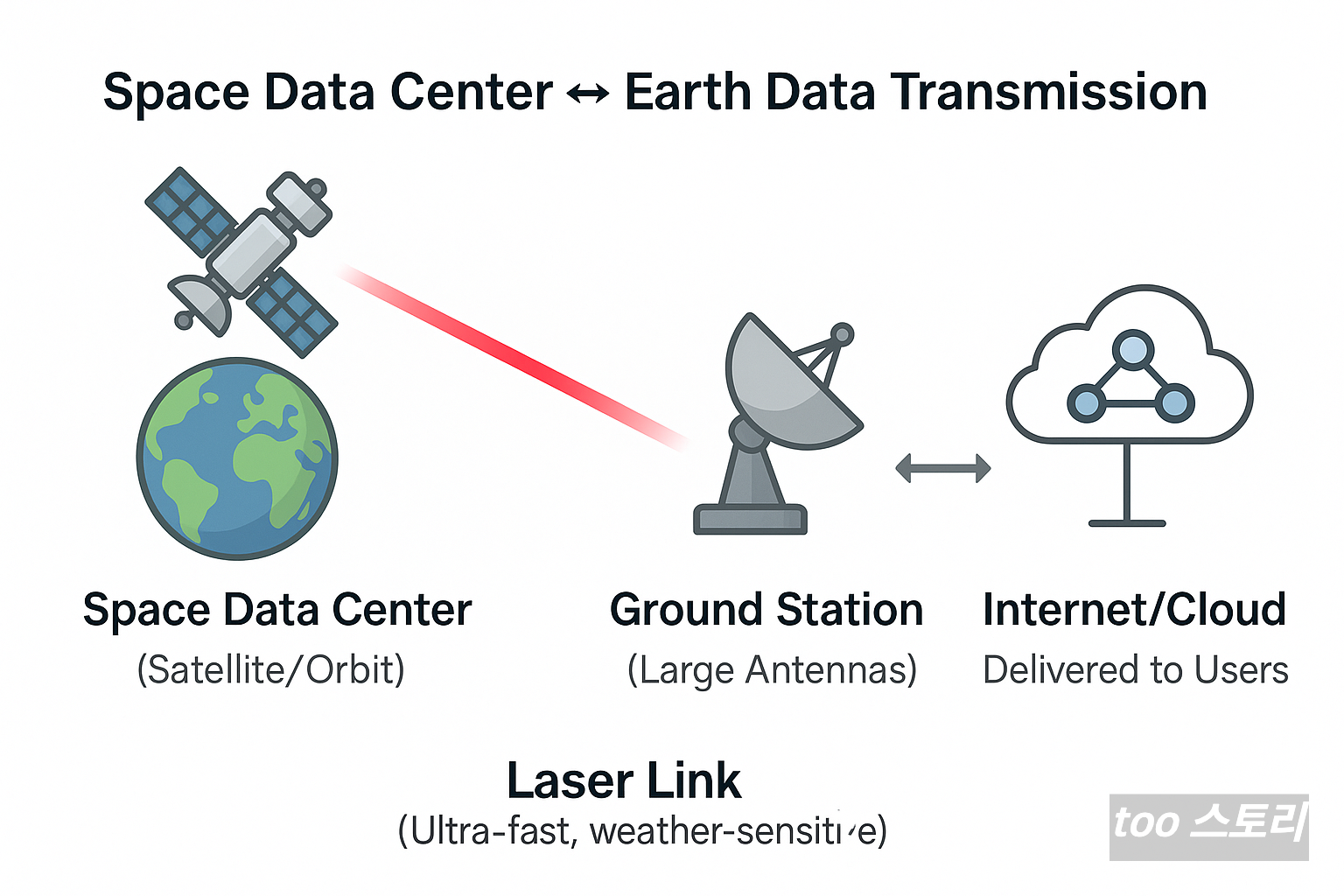 우주 데이터센터와 지구 간의 연결을 일상적인 사물에 빗대어 보면 이렇게 이해 할 수 있습니다.
